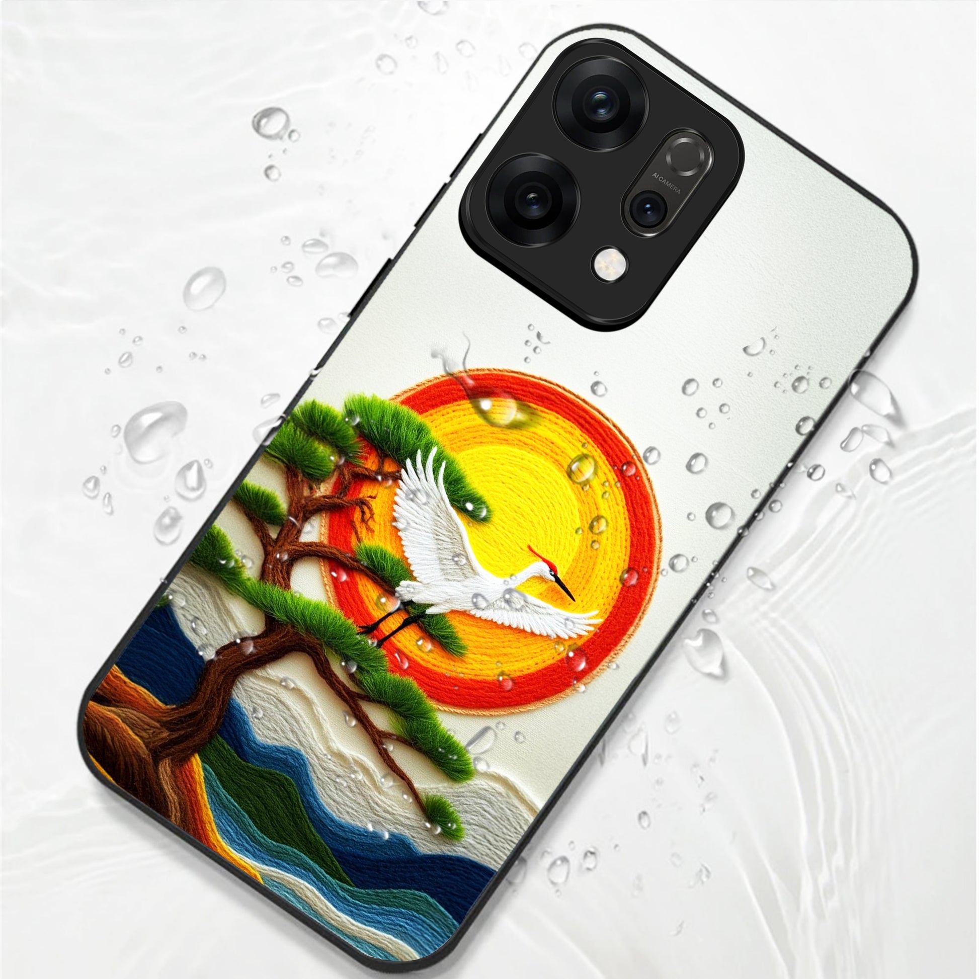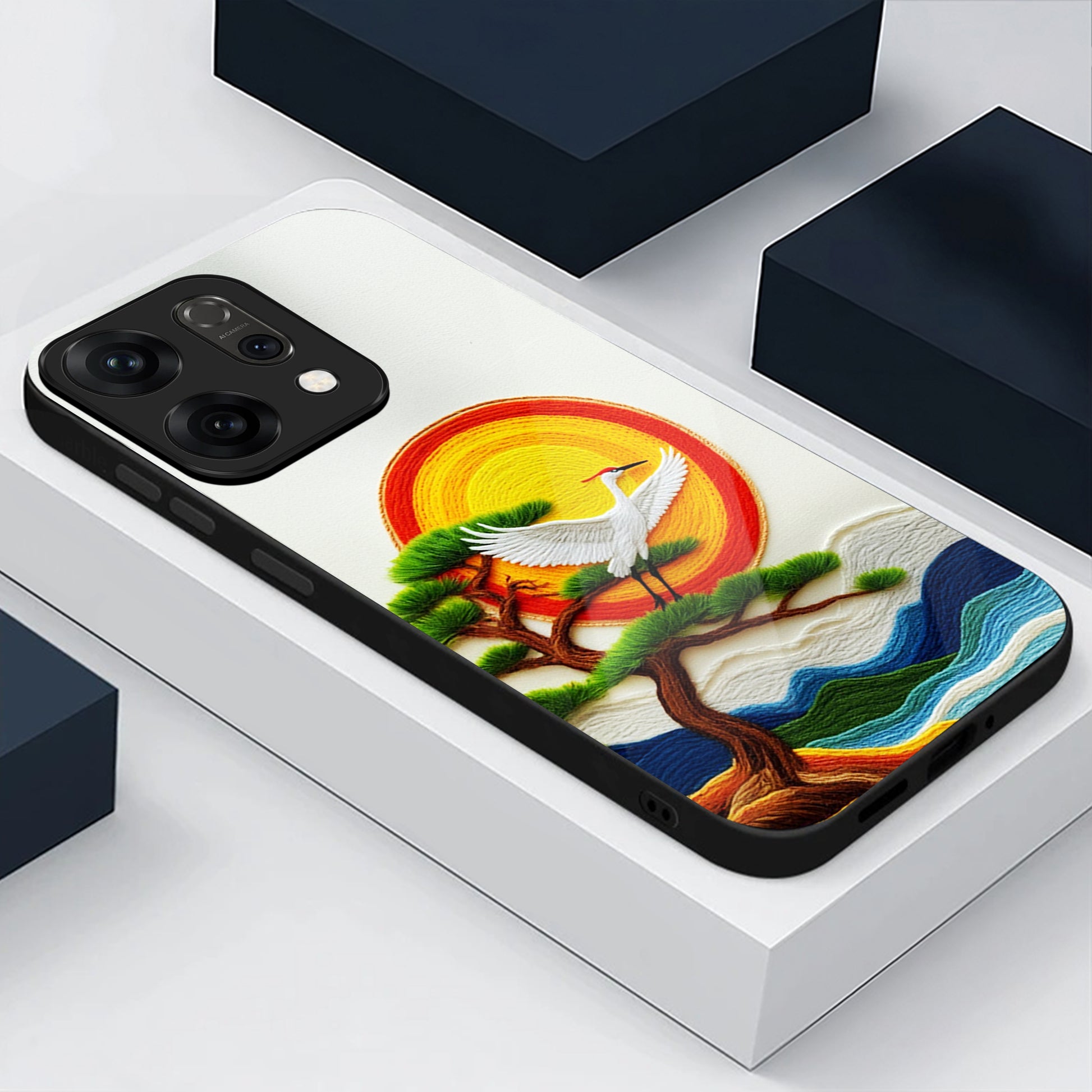 Oppo Reno 14 5G 3D Embroidery Style Crane Aesthetic Glass Case