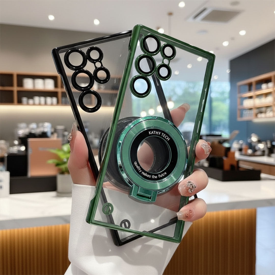 Your Samsung Galaxy S23 Ultra 5G deserves more than a basic cover. This Ultra-Thin Phone Case brings together a frameless clear design, scratch resistance, and bold colored edges that make your phone pop. The foldable ring stand adds grip and doubles as a kickstand, while the magnifier lens detail inside the stand acts as a trendy showpiece. A lightweight case that’s sleek, stylish, and protective.Features